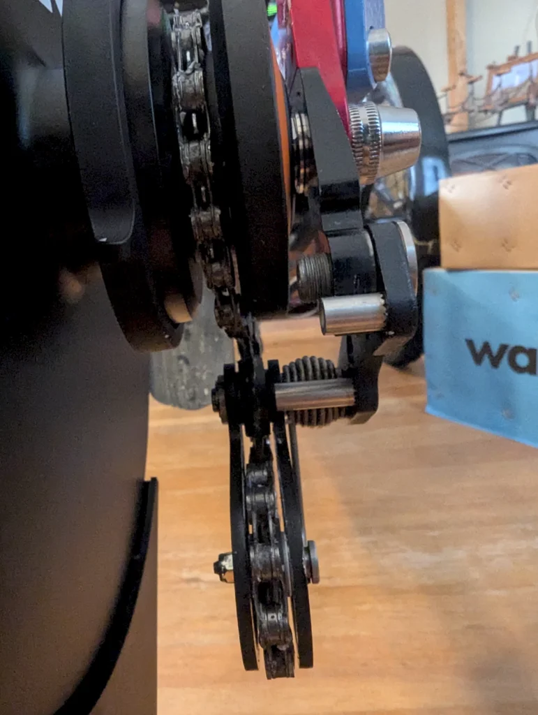 I think the tensioner would have worked if we would have gone with a cassette option on the kickr core 2, using the gear on the cassette that best lined up with the tensioner. This would eliminate the derailleur work around. The Zwift cog and click system is available separately and does not require the cog part to function as a shifter in riding apps. This is only an issue when you have an Internal gear hub on your recumbent.